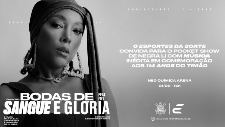 Before the ball rolls, invited by Esportes da Sorte, the Corinthian singer Negra Li will sing some of her hits at the Neo Química Arena, in Itaquera. The artist's performance will also feature a new song to honor Timão and the black-and-white crowd, and the pocket show will include the drumming of Gaviões da Fiel.
