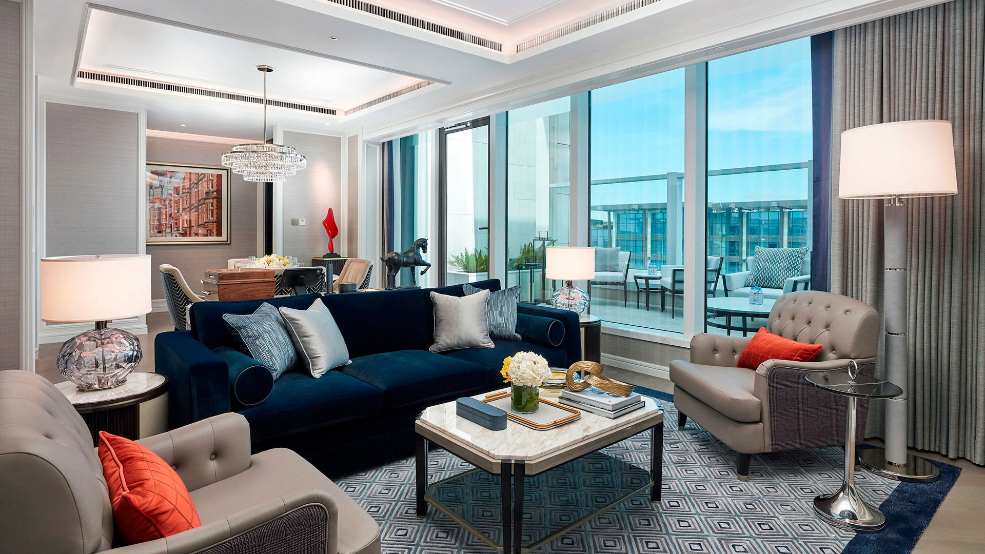 The design of the hotel, led by Peter Silling & Associates, draws inspiration from London’s Mayfair district, incorporating elements of Georgian architecture. The rooms and suites are styled to evoke a townhouse-like atmosphere, with open-plan layouts designed for both comfort and socializing. Some suites offer private terraces, children’s rooms, and exclusive plunge pools for a more tailored experience.