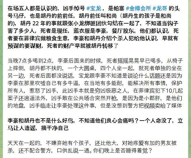 According to netizen revelations, Hu Dan's current partner was the victim, her ex-boyfriend was the gunman Baolong, and her previous ex was a man nicknamed "Monk," with whom she also had a child.